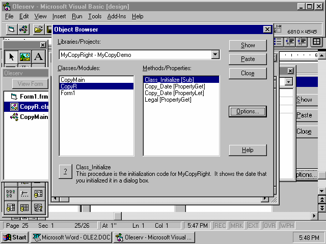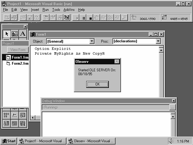 To see how OLE In Process servers work, try the following procedure. This procedure shows you how to create a server that displays copyright information and does a couple of other things for clients that call it. Follow these steps to create the OLE