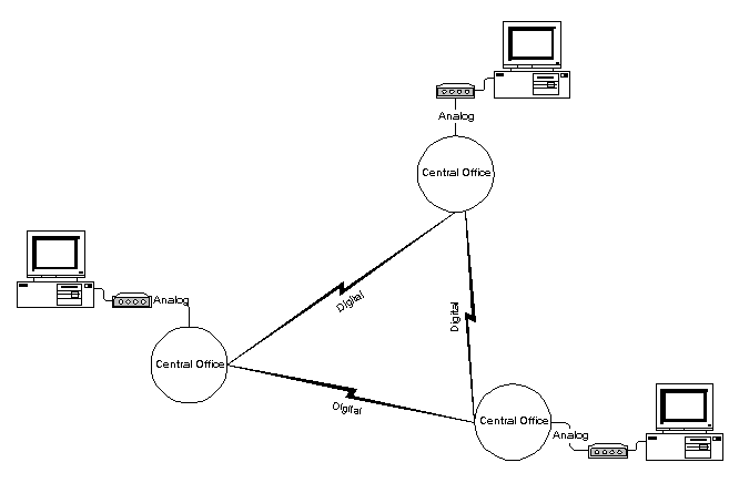 user's telephone and the central office (CO). Within this loop, voice is transmitted in analog format and a modem must convert the digital computer data to analog. Digital networks are gradually replacing analog in the local loop to conform with the