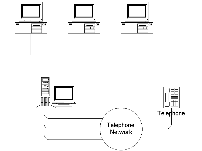 Multiple PCs can also share telephony resources through a LAN-based voice server, as shown in Figure 26.5, in order to maximize the use of telephony and existing network resources. This voice server distributes data to appropriate PCs from the telephone
