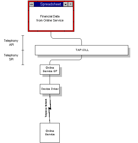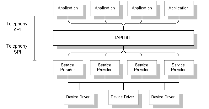 provider interface (SPI). The SPI is used to establish the connection and communicate with a specific telephone network. TAPI supplies a Telephony DLL component, called TAPI.DLL, which resides between the Telephony API and the Telephony SPI. TAPI-compliant