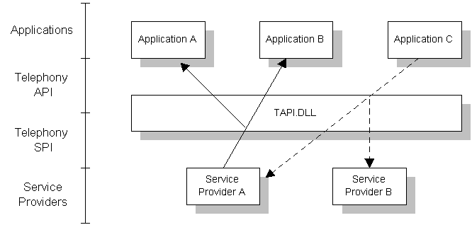 The solid arrows in the figure show that several different applications can use a device controlled by one service provider at the same time. TAPI.DLL allows both applications to open the device without concern for contention. These applications can