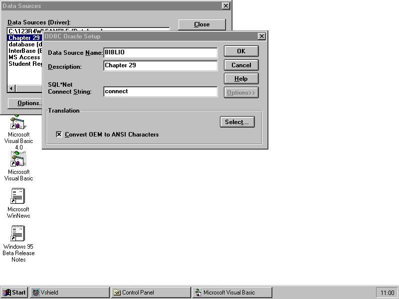 In this chapter, you looked at the features of ODBC as well as some of the benefits of ODBC. You learned to use a Data control to open an Oracle type database. You also explored the properties and methods of the Data control and the Data Access Objects that apply specifically to ODBC databases. Finally, you looked at a few of the ODBC API calls, their Visual Basic equivalents, as well as some examples illustrating the functionality of the ODBC API.