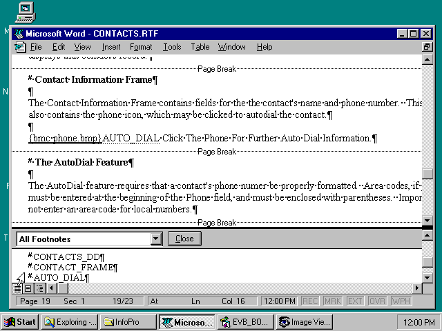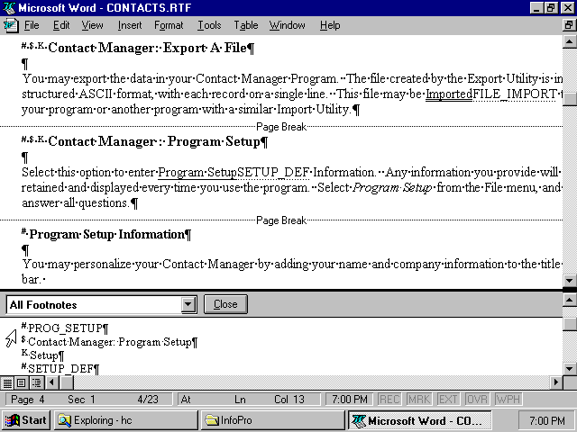 As you can see, the custom footnote symbol(s) must be the first item(s) on the jump page, followed by the Help Topic Title, and any other help text. To place a footnote using Word, you select Footnote from the Insert menu, which brings up the Footnote