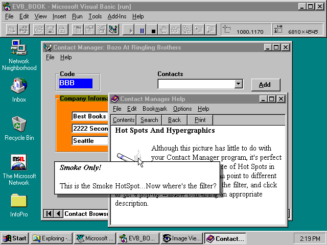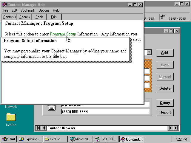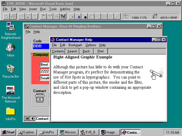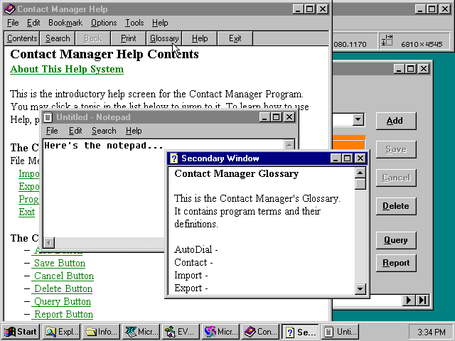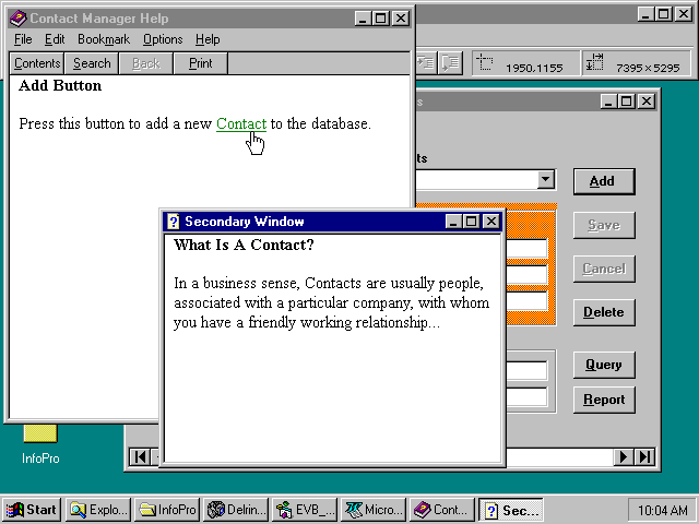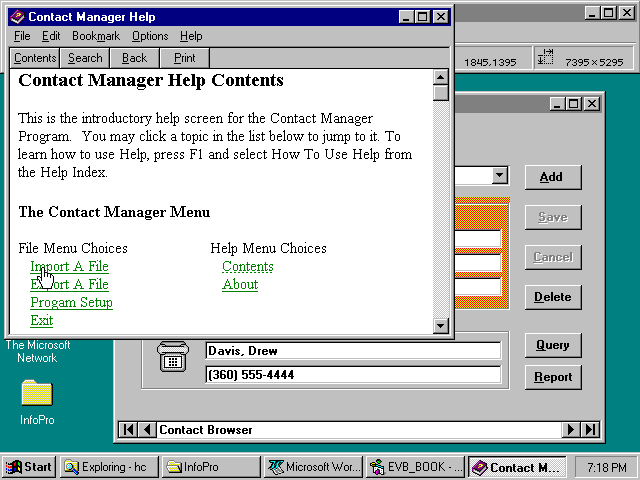 That's it for running Help macros from your custom Help system. You should now re-compile and start up the Contact Manager program for testing. Be sure to admire and test all your new buttons and menu items, and notice that the NotePad starts up