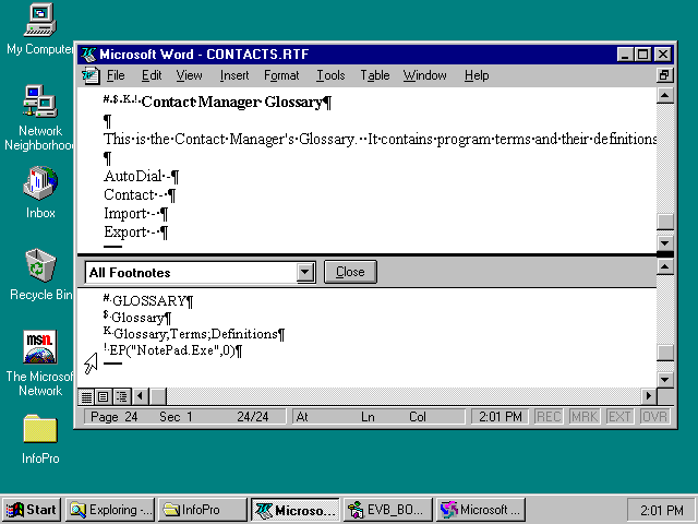 To call a macro from a topic footnote, you use the special footnote symbol (!), an exclamation mark. Now open CONTACTS.RTF, and add a new page at the bottom. This is where you'll define your Glossary topic. Refer to Figure 34.19 for the topic text