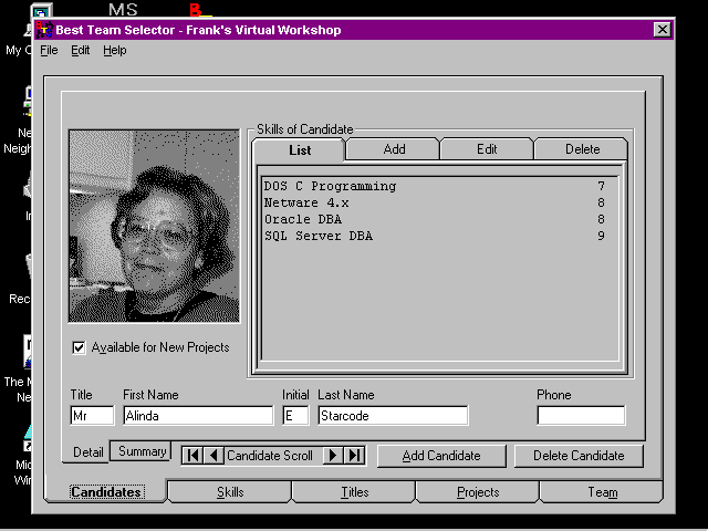 In the sample database Frank's Virtual Workshop, many of the skills are technology-oriented, such as VB Programming. Each skill a candidate has is rated on a scale from 1 to 10 with 10 being the best, and 1 being, well, really bad. To see the skills of