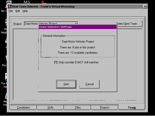 Pressing the Select Best Team button brings up the Settings form that lets you specify whether or not you only want exact skill matches to be considered. This means that if exact skill matches are required, a candidate that is missing any skill defined
