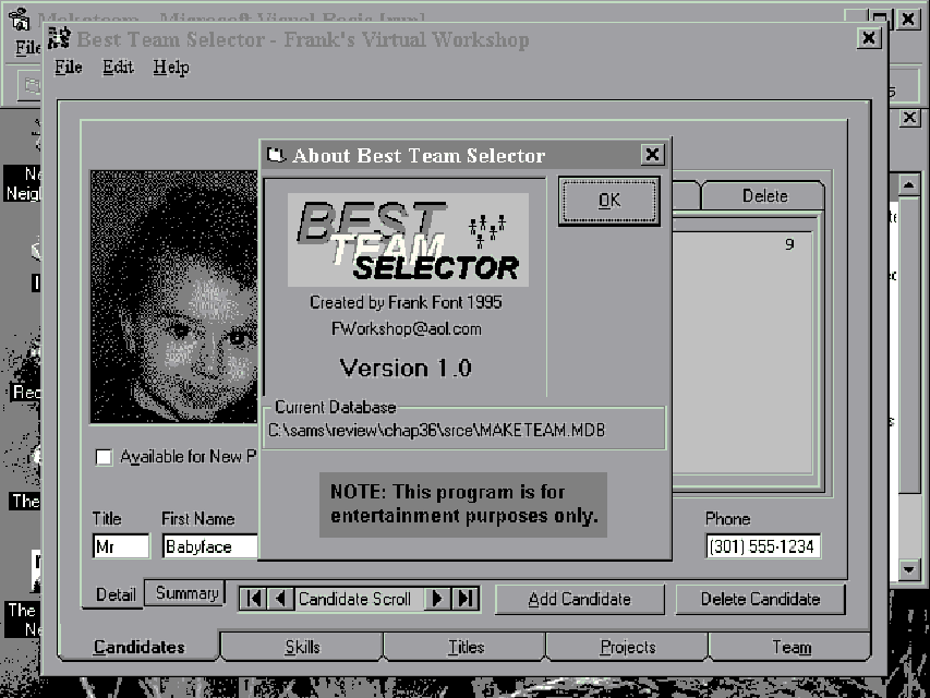 The program discussed in this chapter is included on the CD-ROM as the Best Team Selector. Figure 36.1 shows the Best Team Selector program main screen. In a small and hopefully interesting way, it demonstrates some of the power that Visual Basic 4.0