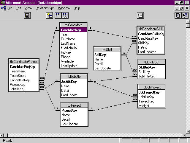The candidate records are in their own table. Likewise, there is a table for skills and a table for projects. Connecting these tables are linking tables that relate the contents of the tables to each other. For example, tblCandidateSkill is a table that