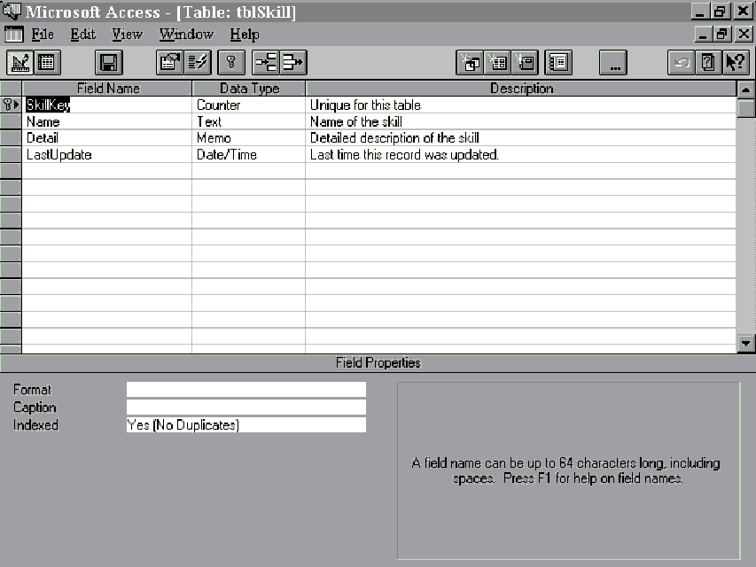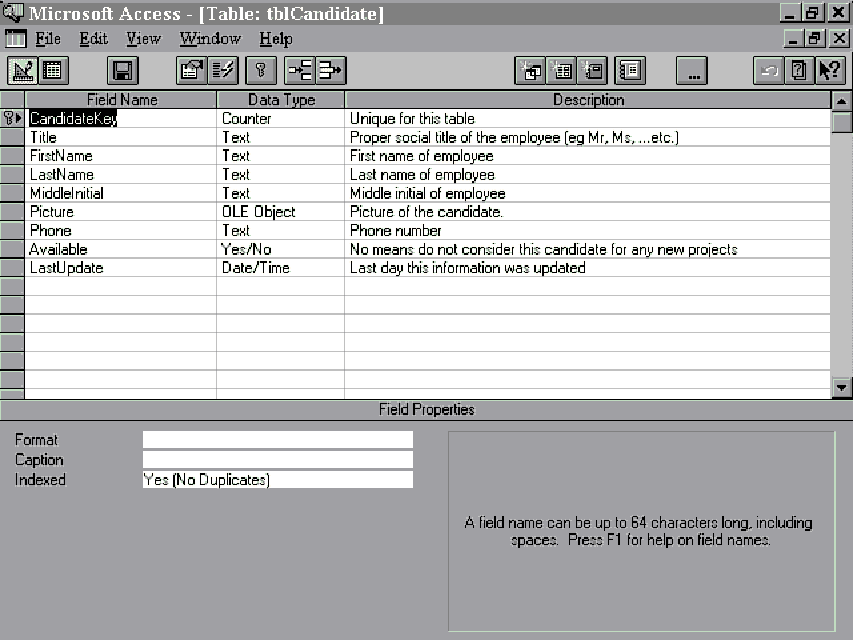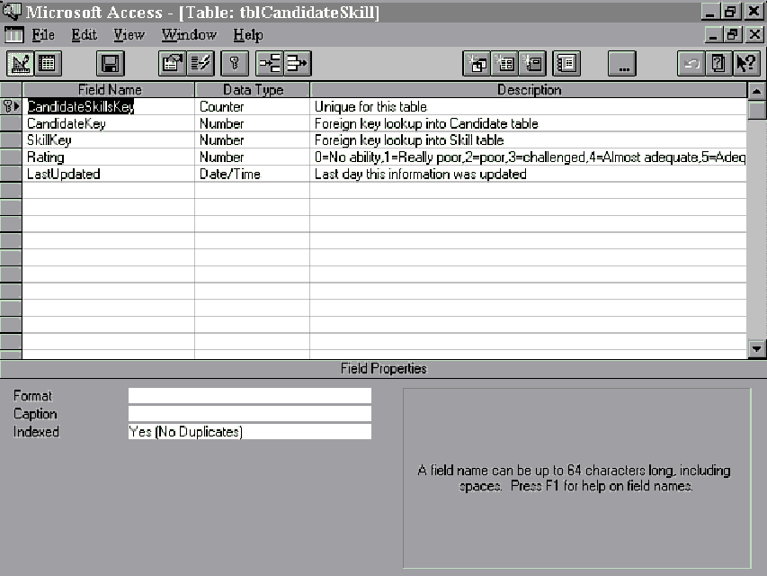 links skills from tblSkill to candidates from tblCandidate. Figures 36.6 through 36.8 show the structure detail of these particular tables.