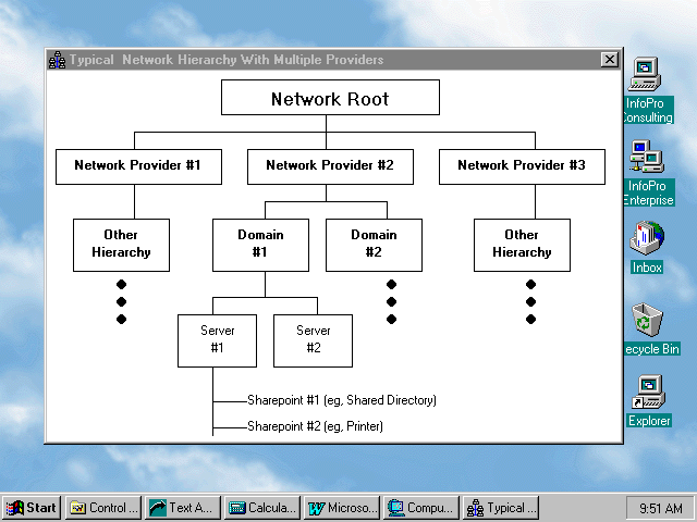 In Figure 38.1, the hierarchy for Microsoft Advanced Server resources is shown in detail as Network provider #2. Network resources from other providers (#1 might be Novell, for example, while #3 is Banyan) have different hierarchical systems. However,