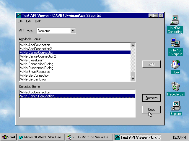 After the file is loaded, select Declares from the API Type drop-down list. In the Available Items list, locate WNetAddConnection and double-click it to add it to the Selected Items list. Do the same for WNetCancelConnection. Your screen should look