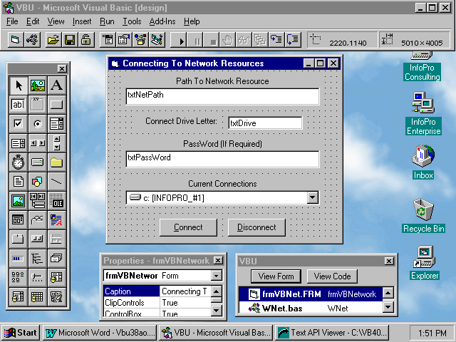 there's also a TextBox control for entering the password. The DriveList control will be used to verify a successful connection, as well as to select a current resource for disconnection.