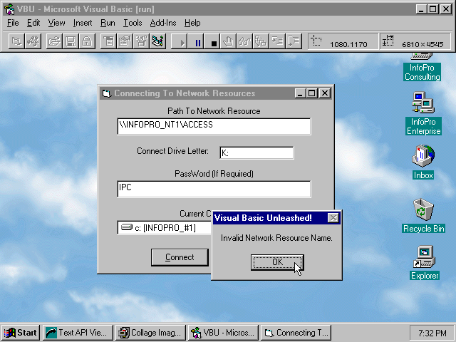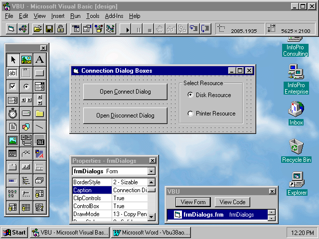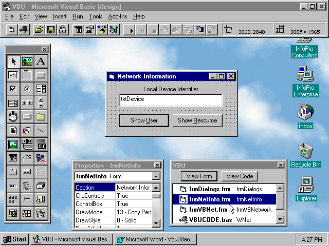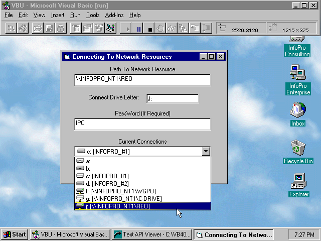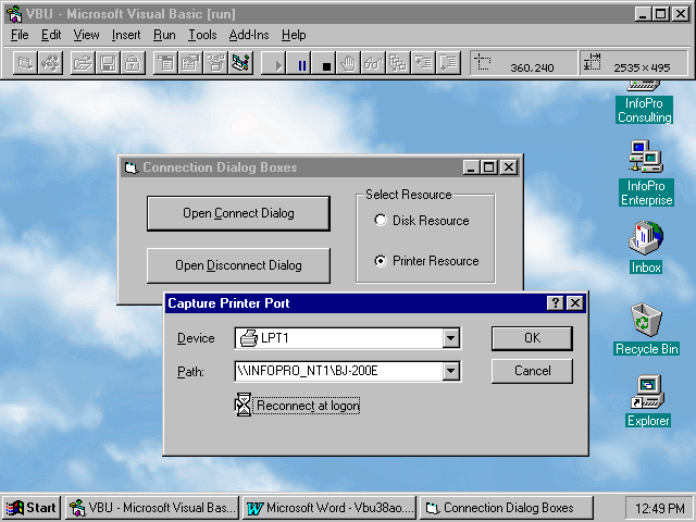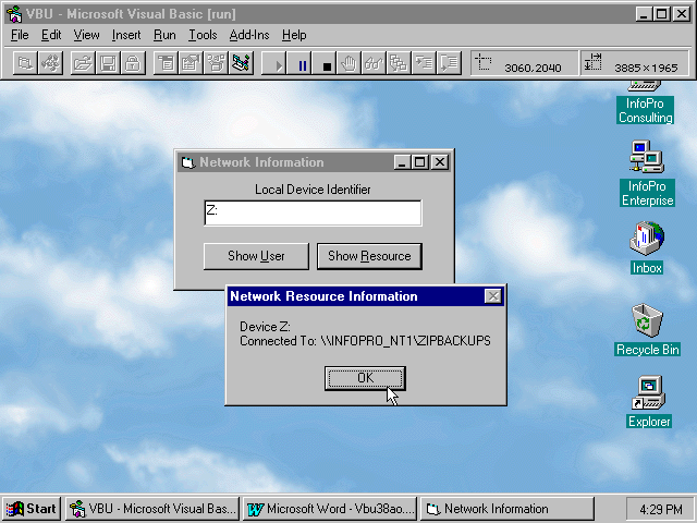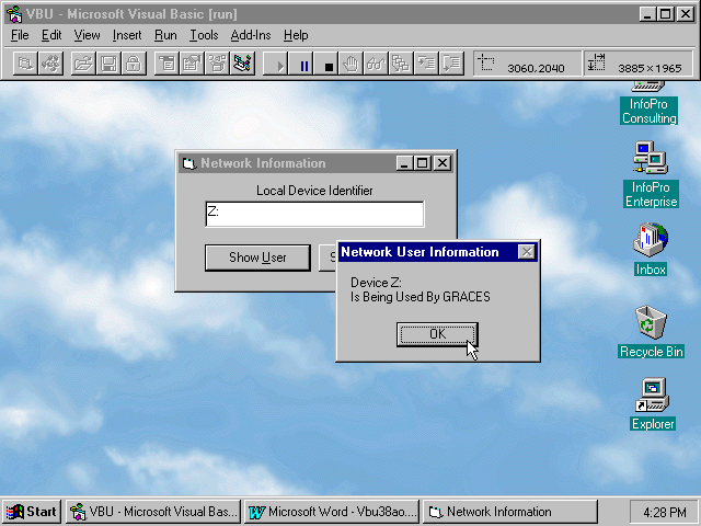 Okay, go ahead and test your form on your own network. See Figures 38.10 and 38.11 for sample output. Figure 38.11 shows some resource connection information, as displayed by the frmNetInfo program.