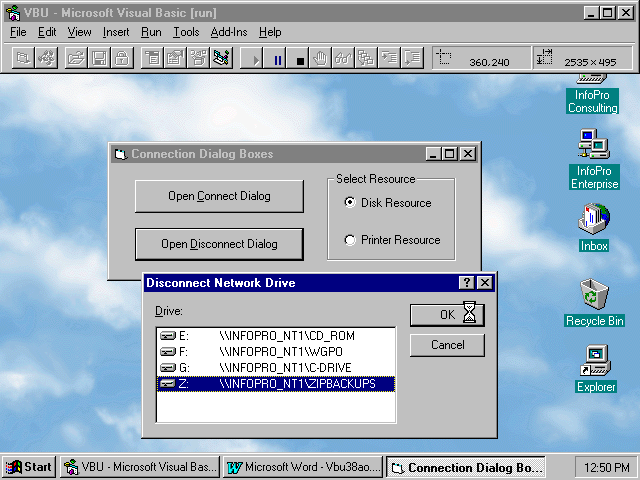 Private Sub cmdDisconnectDialog_Click() Dim Succeed As Long Dim Resource As Long If optDisk Then Resource = RESOURCETYPE_DISK Else Resource = RESOURCETYPE_PRINT End If Succeed = WNetDisconnectDialog(hWnd, Resource) End Sub