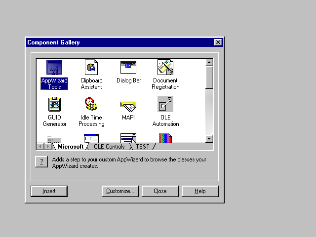 The Visual C++ development system comes equipped with a series of standard components. These include components for adding clipboard support, support for dialog bars, palettes, popup menus, a splash screen component, a Tip of the Day component, About dialog enhancements, and much more. You can also add classes representing registered OLE controls through the Component Gallery.