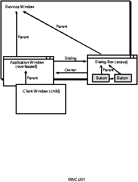 Another relationship exists between top-level windows. A top-level window may have an owner, which is another top-level window. An owned window always appears on top of its owner and disappears if its owner is minimized. A typical case of a top-level window owned by another occurs when an application displays a dialog box. The dialog box is not a child window (it is not confined to the client area of the application's main window), but it remains owned by the application window.