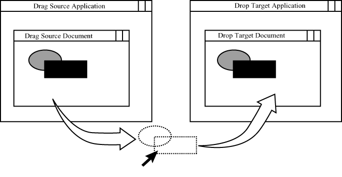 Drag and drop represents a technique of sharing data between applications that act as drag sources and applications that act as drop targets. Drag sources are applications that enable their items to be dragged from their windows to the windows of other applications. Drop targets are applications that accept items dragged from drag sources and released within their window (Figure 31.1).