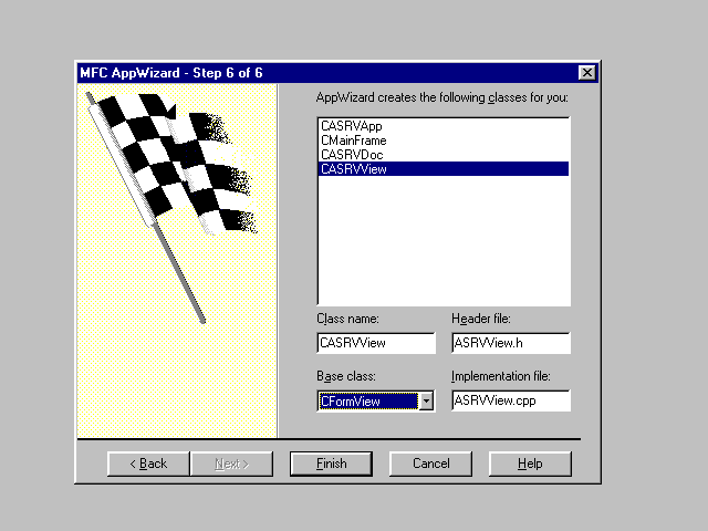 We should also change the base class of the new application's view class before dismissing AppWizard. In AppWizard Step 6 (Figure 32.3), select the class CASRVView and select CFormView as its base class. As a CFormView-based class, our new view class uses a dialog template to provide its visual appearance.