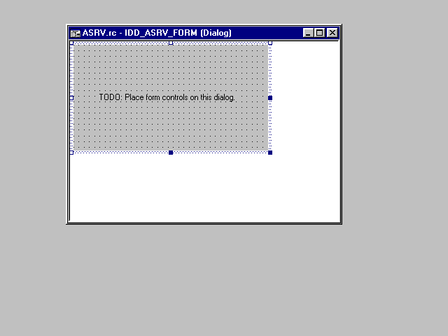 The first step in implementing the calculator is to create its user interface. AppWizard created us a dialog corresponding to the CFormView-derived view class; however, the dialog is spartan, to say the least (Figure 32.4). Edit this dialog by removing the default TODO field and adding three edit fields, a button, and a static field as shown earlier in Figure 32.1.