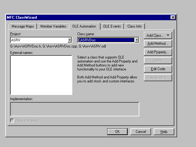 The first step in adding automation support is through the ClassWizard. To add properties and methods to the CASRVDoc class, invoke the ClassWizard, select the OLE Automation tab, and select the CASRVDoc class (Figure 32.6).