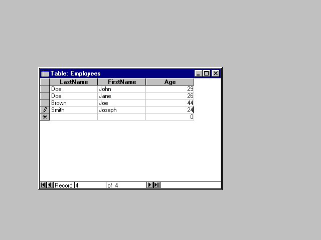 Figure 34.2 shows the newly constructed Employees table just before it is saved. As you can see, three fields were added (LastName, FirstName, and Age) of which the first two are 50-character-wide text fields, the third is a number field. The table's primary key was set to the combination of the LastName and FirstName fields.