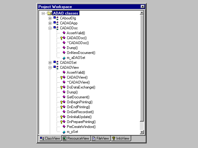 The view class contains a pointer of type CADAOSet (m_pSet); in the default implementation, this pointer is set to point to the document object's m_aDAOSet member. The view class also has a new member function, OnGetRecordset, which in the default implementation simply returns m_pSet.