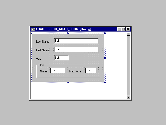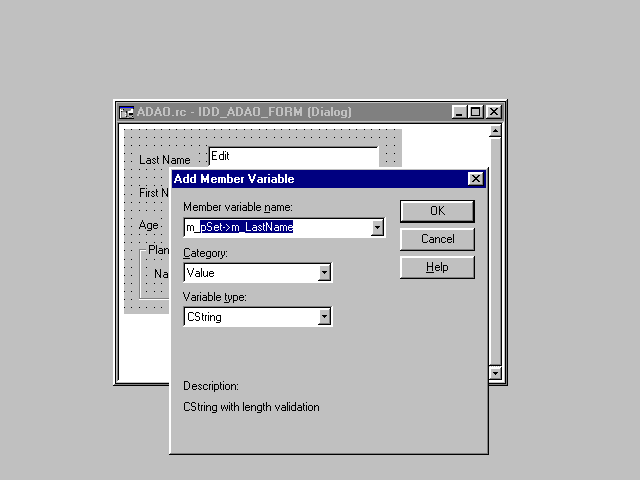 Name the five edit fields IDC_LASTNAME, IDC_FIRSTNAME, IDC_AGE, IDC_NAME, and IDC_MAXAGE as appropriate. Before dismissing this dialog, you can also use the ClassWizard to identify dialog fields with corresponding recordset member variables.