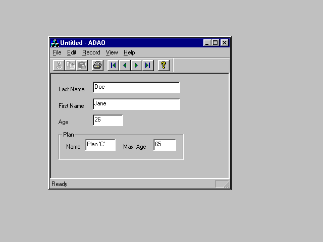 The database used in this example contains two tables. One table contains the first names, last names, and and ages of employees; the other table contains the names of benefit packages offered to employees and the maximum qualifying age for each package. The purpose of our application, which I decided to call ADAO, is simple: display, for each employee, all benefit packages he or she qualifies for.