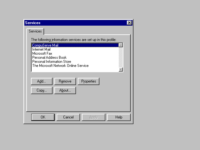 There can be several profiles defined for a user. Each profile describes a series of service providers and their operating parameters. For example, a typical profile may include the Microsoft Personal Information Store (message store provider), the Microsoft Personal Address Book (address book provider), Microsoft Fax (transport provider), and the Microsoft Network Online Service (address book and transport). MAPI profiles can be edited using the Microsoft Exchange client; select the Services command from its Tools menu (Figure 35.2).