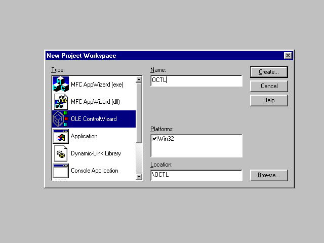 To begin, select New from the Developer Studio File menu, then select Project Workspace in the New dialog. In the New Project Workspace dialog select OLE ControlWizard as the project type, type in a name for the new project (for example, OCTL), and select a suitable directory (Figure 36.2).