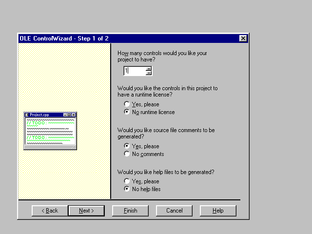 After you click Create, the first page of the two-page OLE ControlWizard appears (Figure 36.3). On this page, you can specify the number of controls in your project (a single OLE control project can contain multiple controls), whether you want licensing support, and whether you want source comments and support for a help file. (Specifying help file support is generally a good idea; it is much easier to throw out code later than trying to add it to your project.)