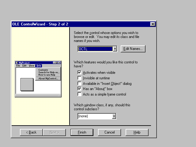 On this ControlWizard page, several additional properties can also be defined. I would like to bring your attention to two of these. The Invisible at runtime option enables you to create controls (such as the Microsoft Comm control) that do not have a visible interface at runtime. The Available in "Insert Object" dialog option enables you to create a control that can be inserted into OLE container documents. This option should typically remain unchecked; after all, when you create a new button meant to be used in dialogs, you may not want someone include it in a Word for Windows document!