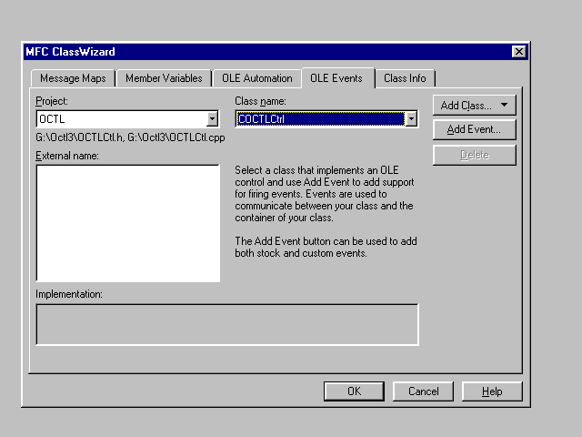 Events are also added to an OLE custom control through the ClassWizard. To add an event, use the ClassWizard's OLE Events tab (Figure 36.10).