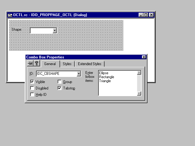 In the case of OCTL's single property page, there are only two controls to be added: a static label and a combo box. The combo box should be of type Drop List, with the identifier IDC_CBSHAPE; the Developer Studio dialog editor can also be used to set its list box values (Figure 36.12). Note that in order to enter multiple values in the area reserved for list box initializers, you must use the Ctrl+Enter key combination to generate a line break, as pressing Enter alone would close the property sheet altogether.