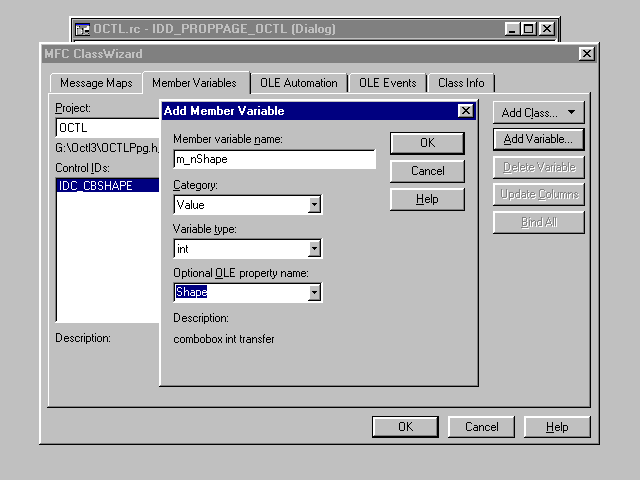 A member variable for the new property page can be added using regular ClassWizard procedures. What is not regular is how this member variable (that will be a member of the class COCTLPropPage) connects with the appropriate property of the OCTL control. To create this connection, you must also specify the name of the OLE property in ClassWizard's Add Member Variable dialog (Figure 36.13).