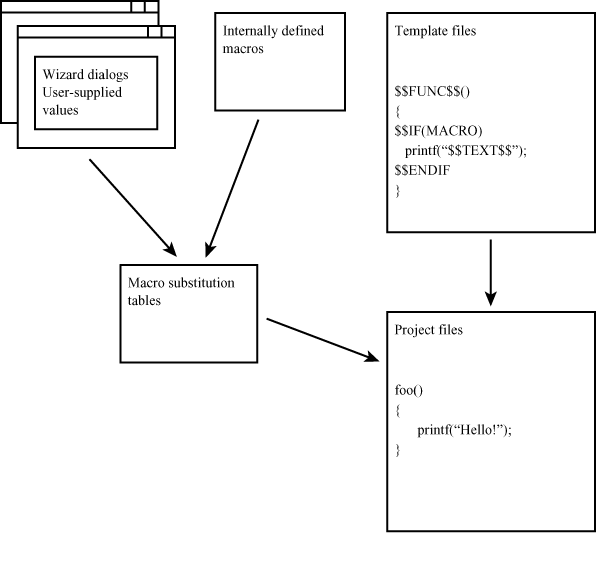 When AppWizard begins generating a new project, it builds project files from a set of templates. The templates are processed and any macro references in them are expanded with the internally defined or user-supplied values.