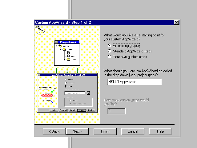 You can base the new custom AppWizard on an existing project. With the help of the new AppWizard, the custom AppWizard user will be able to create projects that are identical copies of the original, except for the project name that will be substituted throughout the project with a name of his choosing.