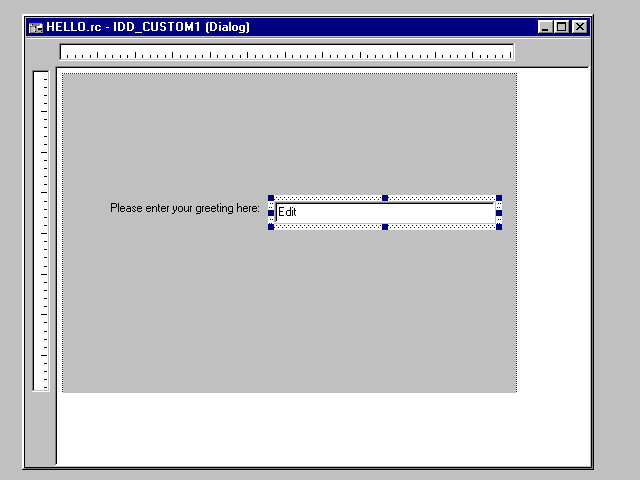 Open this dialog by double-clicking. In it, a single static field contains a "TODO" reminder. This must be replaced. HelloWizard requires the user to enter only one text parameter; accordingly, the new version of this dialog should contain a static label and an edit field identified symbolically as IDC_HELLOTEXT. This new, admittedly spartan-looking, dialog is shown in Figure 40.3.