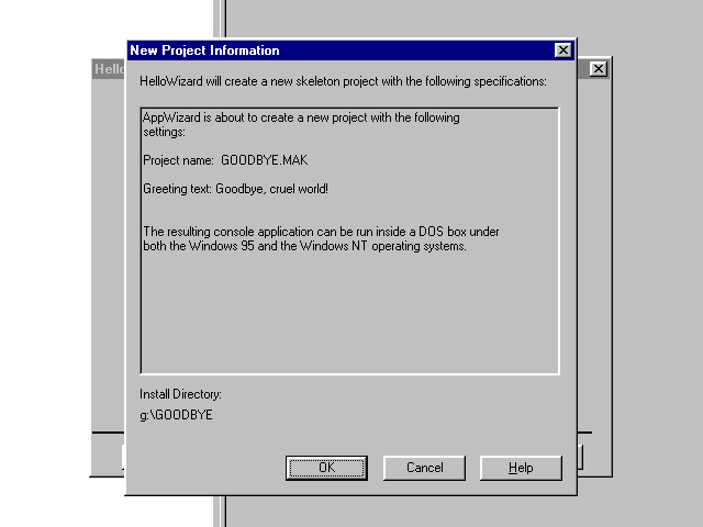 AppWizard is about to create a new project with the following settings: Project name: $$ROOT$$.MAK Greeting text: $$HELLOTEXT$$ $$IF(TARGET_INTEL) The resulting console application can be run inside a DOS box under both the Windows 95 and the Windows NT operating systems. $$ENDIF